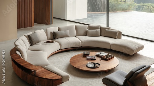 Minimalist living room design with a curved, light-colored sofa and cozy recliners resting on a polished wooden base