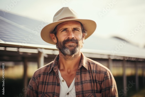 portrait of a middle aged man engineer standing in front of solar panels on farm