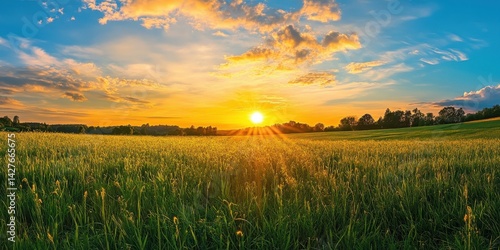 Sky Field. Sunrise and Blue Sky Over Green Grass Field Landscape