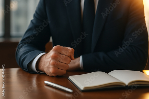 Businessman with clenched fist and open notebook on desk, representing determination, decision-making and strategic planning..