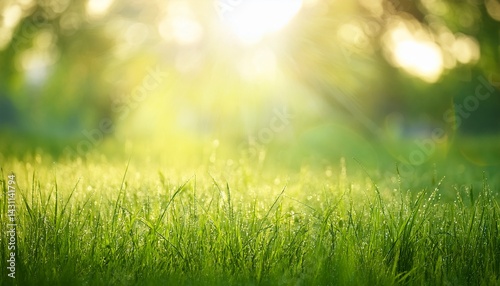 natural grass field background with blurred bokeh and sun rays