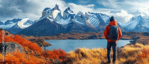 Backpacker looks at mountains lake and autumn foliage under a cloudy sky.