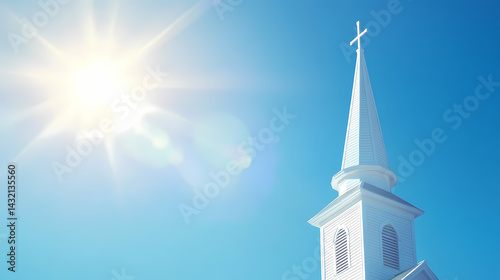 White church spire against a clear blue sky with sun shining brightly. Darklight Spire. Illustration