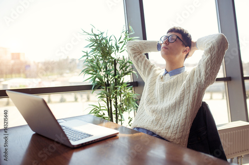 Young atractive business man using his laptop in a cafe, enjoy his dobe job. Freelance time. Start up.