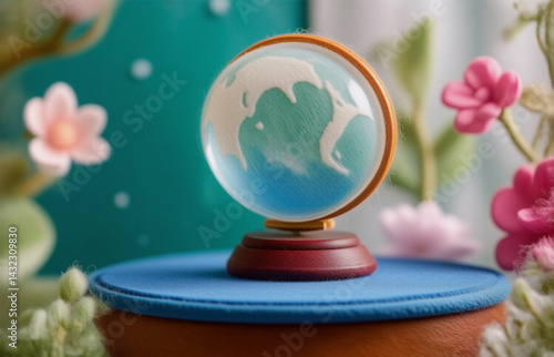 A miniature glass globe rests on a wooden base, sitting atop a blue velvet surface. Surrounding it are delicate artificial flowers, creating a whimsical, enchanting scene.