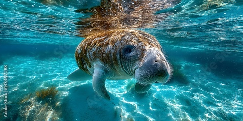 Curious manatee gazes at the camera in clear turquoise water, sunlight illuminating the sandy seabed in this underwater shot.