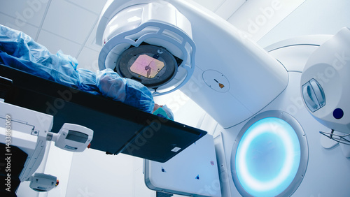 A patient undergoing radiation therapy. Medical linear accelerator in therapeutic oncology. The concept of modern approaches to the treatment of oncology.