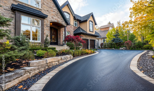 Freshly paved driveway enhances the curb appeal of a beautiful home in a serene neighborhood
