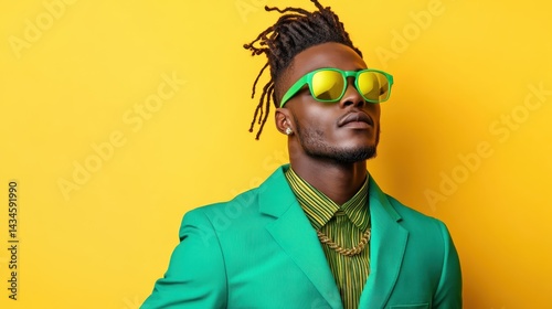 A confident man in a stylish green suit and sunglasses exudes charisma against a bright yellow background, embodying modern fashion and individuality.