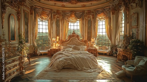 A baroque style bedroom with ornate gold accents rich fabrics and dramatic lighting exuding opulence and grandeur interior