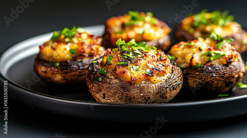 Savory Stuffed Mushrooms on Black Plate with Fresh Herbs and Vibrant Colors