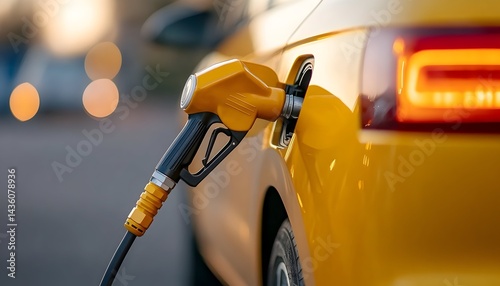 Yellow car refueling at dusk, nozzle inserted into fuel port