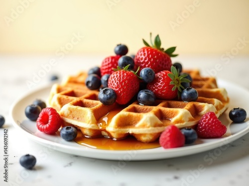 Gofre belga, crujiente por fuera y esponjoso por dentro, generosamente cubierto con una mezcla de fresas rojas, arándanos y frambuesas