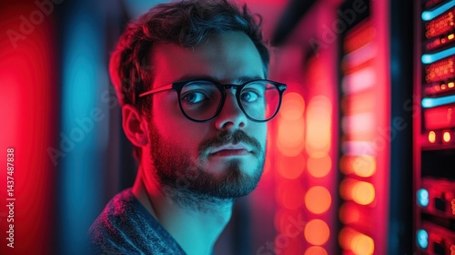 Focused tech professional in server room