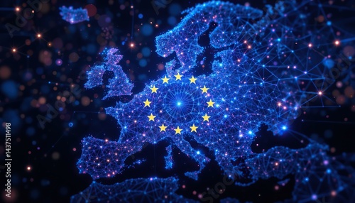 Digital Sovereignty Reimagined with European Union Flag Network Visualization in Vibrant Quantum Design, Representing Geopolitical Connectivity and Policy Innovation