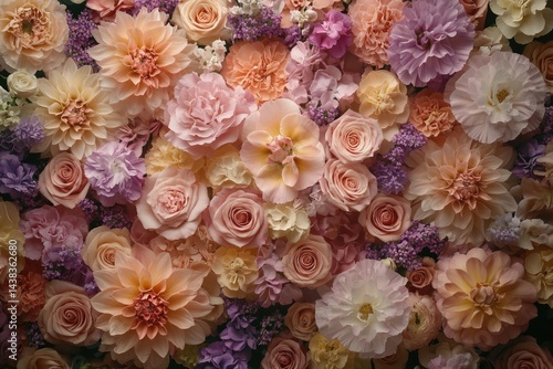A profusion of pastel-toned roses, dahlias, carnations, and other blooms create a stunning floral arrangement.