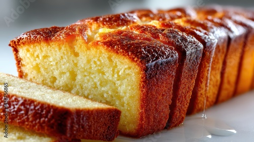 a close-up of a soft, buttery pound cake with a golden-brown crust on a white isolated background, light and moist design