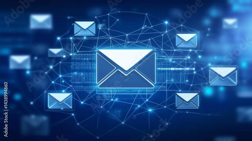 A high-tech marketing dashboard showcasing a 3D email icon surrounded by networked user symbols, visualizing targeted email campaigns and direct client outreach.