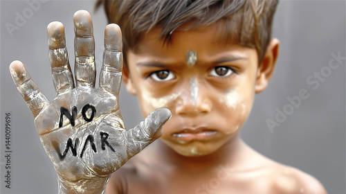Portrait of a child with No War written on their dirt-smudged palm, a plea for peace from the innocent victims of conflict.