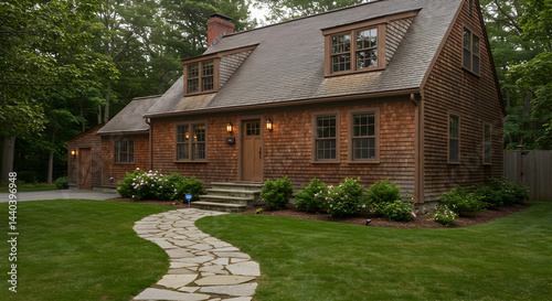 Beautifully Landscaped Shingle Style House with Stone Walkway And Lush Lawn