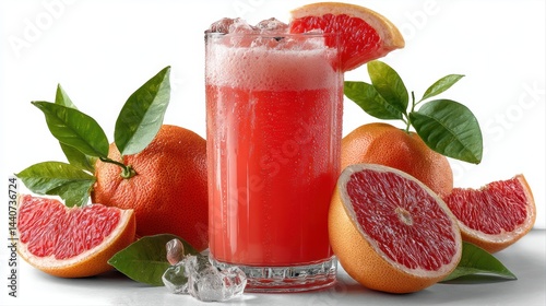a glass of freshly squeezed grapefruit juice with a slice of grapefruit on a white isolated background, tangy and refreshing design