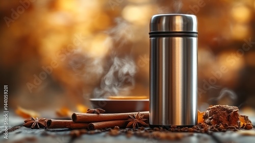 Steamy Beverage with Spices and a Stainless Steel Flask for Warm Drinks