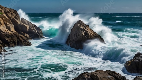 Ocean waves crashing against jagged rocks, slow shutter