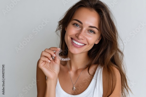 A cheerful woman holding clear dental aligners, promoting good oral health and the importance of maintaining a beautiful smile for self-confidence and well-being.