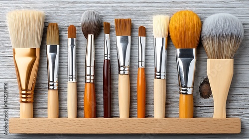 Collection of Various Artist Paint Brushes in Wooden Holder on Rustic Wood Background