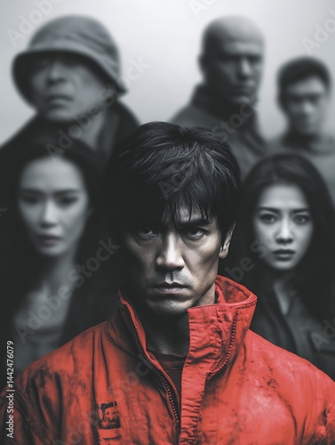 High-octane martial arts movie poster, 15 characters with varied expressions, 9 male fighters in vivid Kung Fu uniforms, 2 female leads in fierce poses, 3 antagonists in dark suits, Kowloon