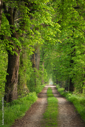Piękna aleja kasztanowa na wiosnę, Polska Śląsk.