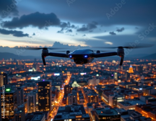 three sleek black scout drones flying in formation over a city skyline at night, with glowing lights below and a sci fi