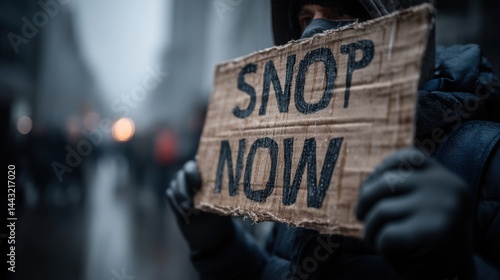 Person holding a cardboard sign that says 'Snop Now' during a protest in snowy weather.