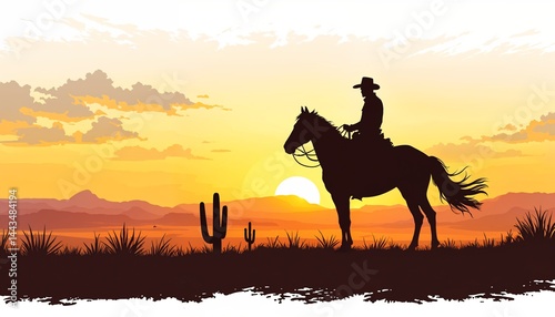 Cowboy's Sunset Silhouette: A lone cowboy rides gracefully upon his horse against a backdrop of a setting sun, the landscape filled with cacti and mountains.