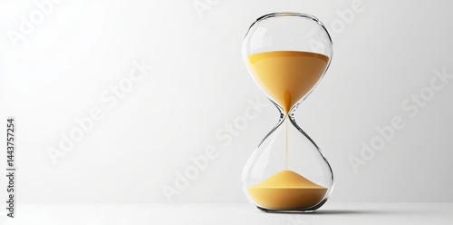 Against a spotless white background, a one-of-a-kind hourglass filled with golden sand highlights the flow of time