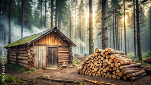 A crackled background with a pile of wood logs in a rustic cabin surrounded by trees and a misty forest landscape , wood, woodpile