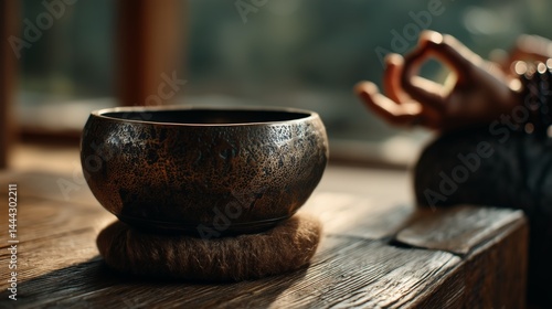 Meditation bowl with hand gesture in serene environment. Tibetan singing bowl.