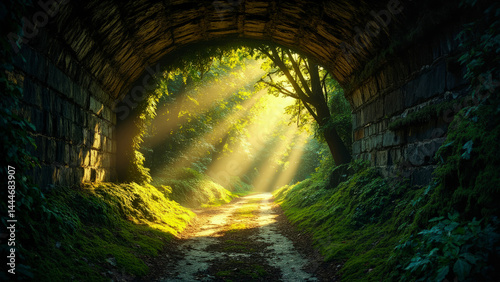 Mysterious tunnel pathway with sun rays beaming through the trees. A road leads to the light at the end of the tunnel.