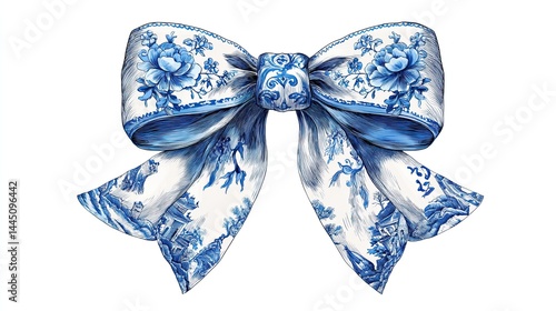Elegant blue and white decorative bow with floral porcelain pattern isolated on white background