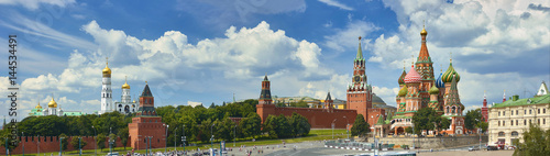 Panoramic view on Moscow Red Square, Kremlin towers, stars and Clock Kuranti, Saint Basil's Cathedral church Ivan bell tower. Panorama from hotel Russia. Moscow holidays vacation tours Putin residence