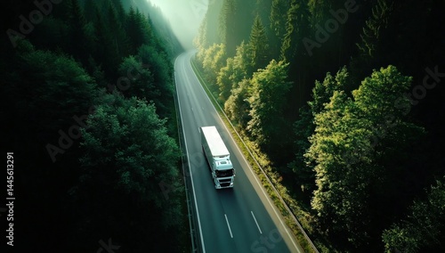 A truck drives along a winding road through a dense, green forest, illuminated by sunlight filtering through the trees, Net Zero Emissions .