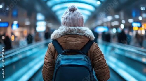 A young traveler wearing a cozy winter coat and beanie walks through a busy airport. The blurred background captures the hustle and bustle of travel around them.