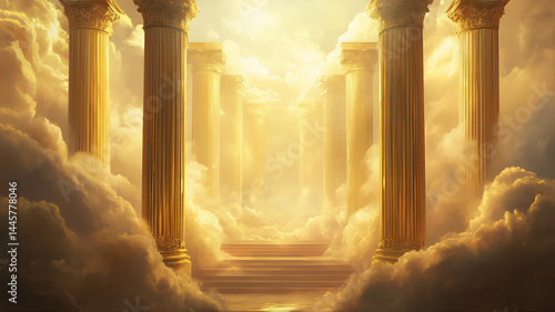 Mount Zion majestic throne of God. Golden light in the heaven with gold column holy heavenly Jerusalem temple, gold heaven sanctuary. Gates of paradise, celestial tabernacle realm holy light arch