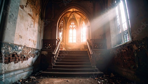 En un edificio abandonado, inquietante y tenuemente iluminado, una luz parpadeante proyecta sombras sobre los muros desmoronados mientras el polvo se asienta en el aire.