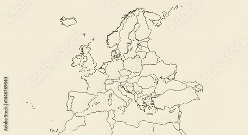 Outline of a detailed map of Europe showing countries and geographical features in a minimalist style Generative AI