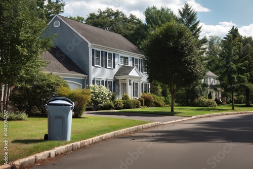 Curbside trash can in suburban two story Cape Cod home neighborhood