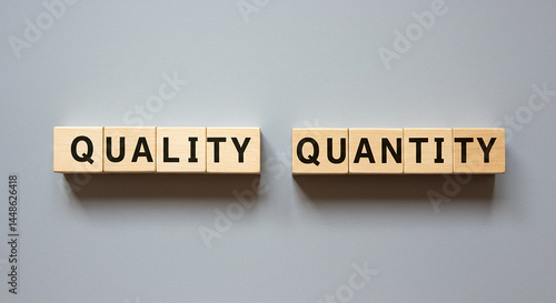 Wooden blocks spelling quality and quantity on a gray background in a studio shot overhead view