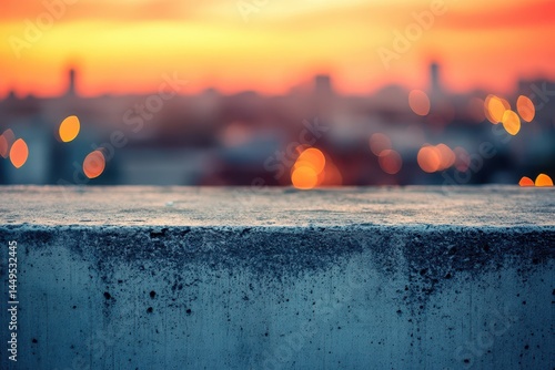 Concrete ledge with bokeh city lights at sunset background. Perfect for quotes, banners, backgrounds, or adding your product.