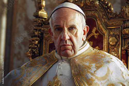A close-up portrait of an imaginary Pope seated on a golden throne in the Apostolic Palace, wearing ornate white and gold vestments, calm and wise expression.