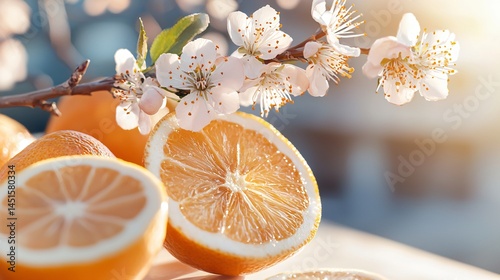 Citrus fruits sliced and placed beside a branch of blooming plum, moody bright contrast, sharp detail on citrus fibers and floral stamens, soft background blur, balanced pastel palette